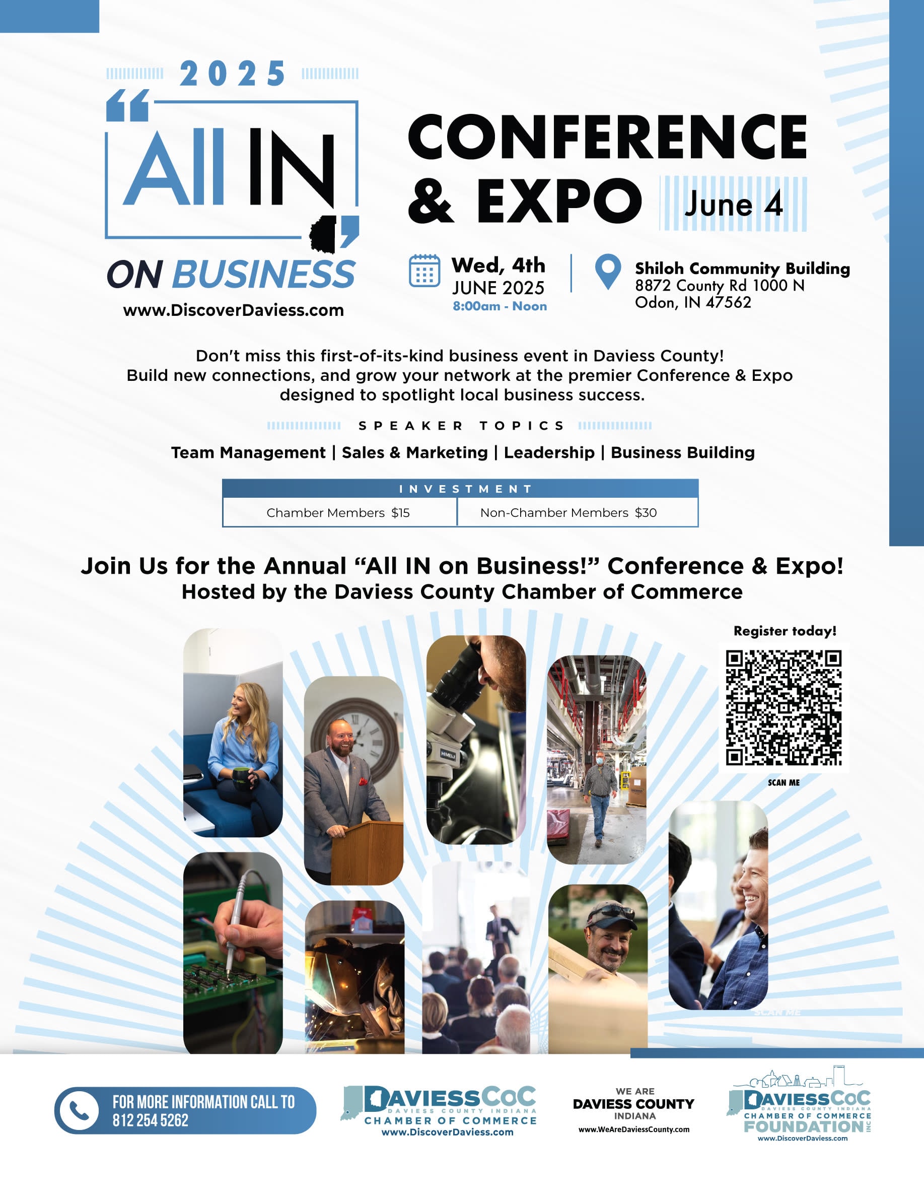 The Daviess County Chamber of Commerce is bringing you the Annual “All IN on Business!” Conference & Expo. It will provide you with the opportunity to showcase your business, develop prospects, and network. We’ll be hosting the “first-of-its-kind” business conference in Daviess County