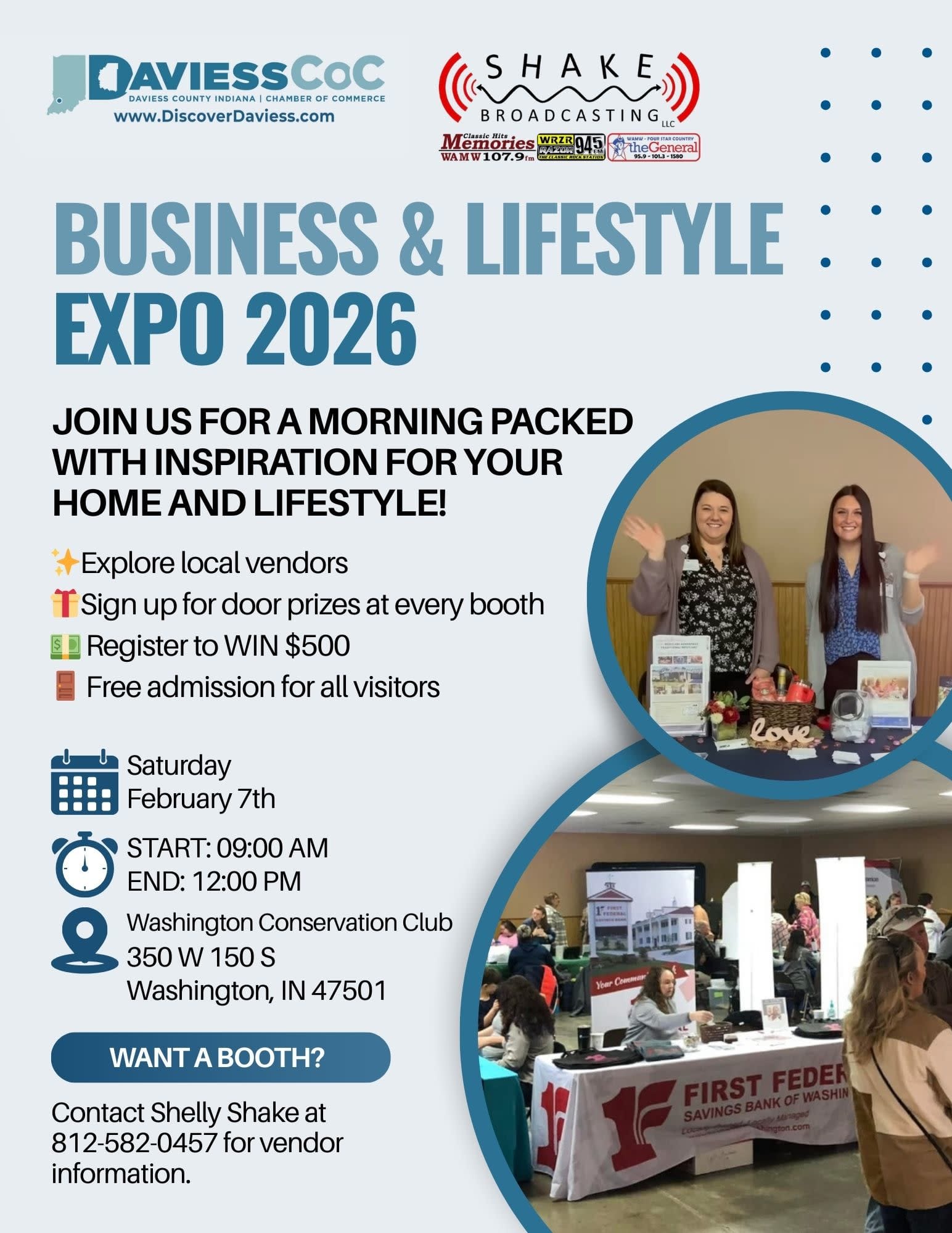The Chamber of Commerce and Shake Broadcasting are very excited to announce our Business and Lifestyle Expo on Saturday, February 7th! Make plans to join us at the Washington Conservation Club from 9am to 12pm and register for great door prizes! The Expo will feature a lot of information from our businesses right here in Daviess County. From banking, insurance, home improvements, health care, and a variety of other services, this will be worth your stop! Tune in for updates and we hope to see you there.